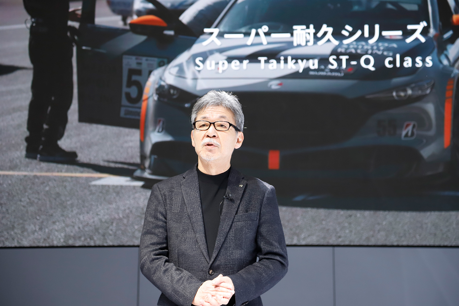 会場のスクリーンには、マツダ車を愛するオーナーたちが集まるイベントでの様子に続いて、マツ耐やメディア対抗ロードスター4時間耐久レースなど、モータースポーツのグラスルーツ・カテゴリーを応援するマツダの企業姿勢をアピールしました。