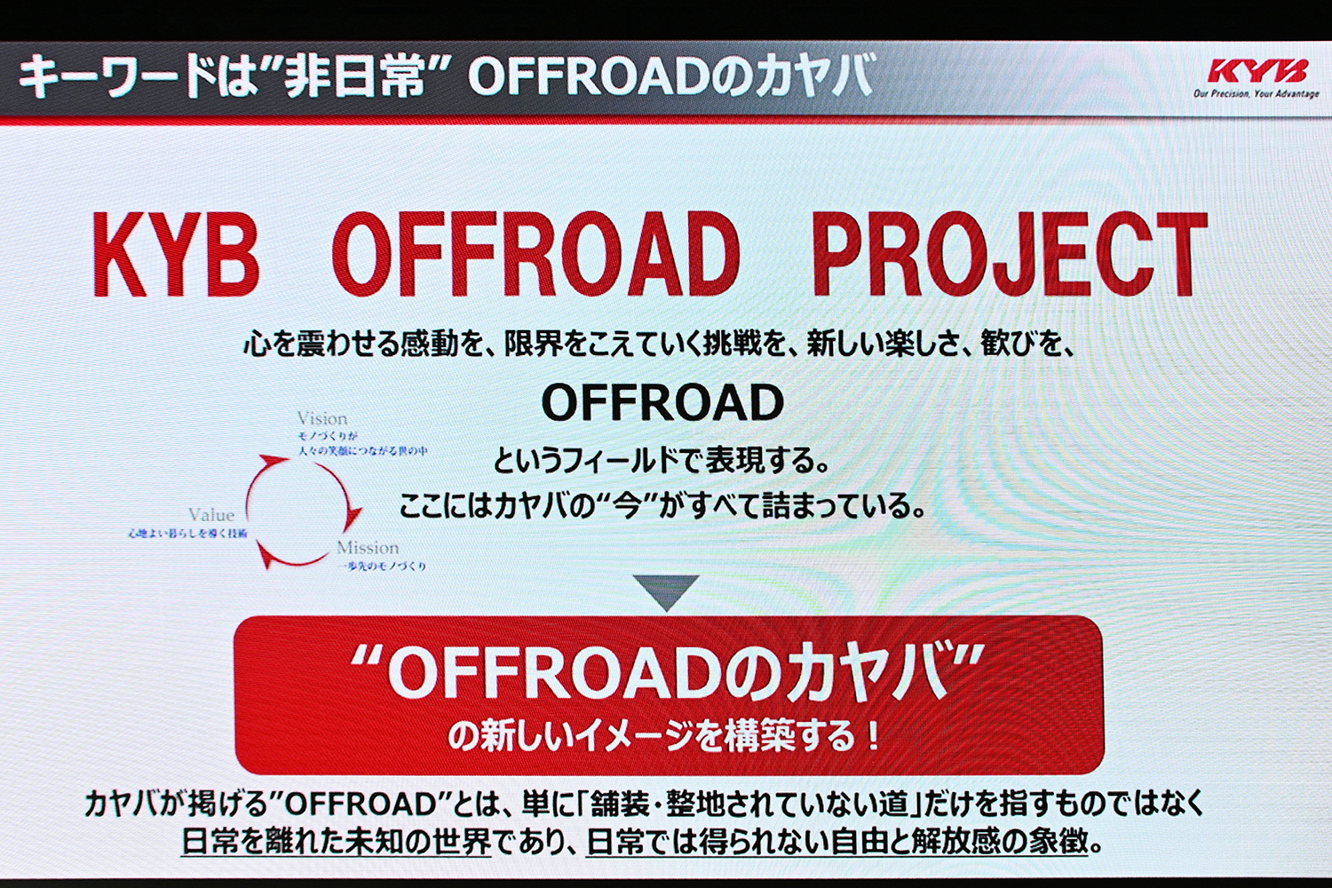 国内のショックアブソーバーシェア1位で、今年創立90周年を迎えるカヤバ(西ホール)は、KYB OFFROAD PROJECT「OFF WE GO !」という新たなブランドの展開することを発表しました。