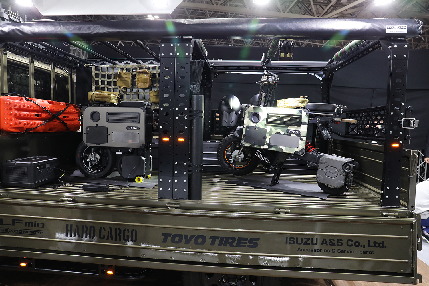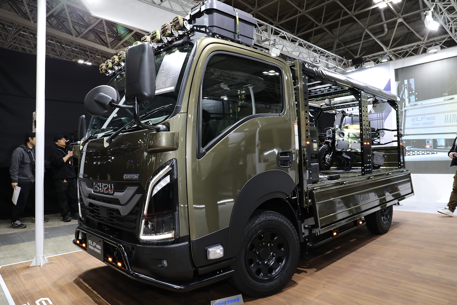 2024年7月に、業界初のオートマ限定普通自動車免許で運転できる3.5トンの最新車、「エルフミオ」をベースとしたコンセプト車は2台。「ELFmio CROSS CONCEPT」は、SEカスタムシングルキャブ平ボディがベース。軽トラックのカスタマイズブランドで大人気のハードカーゴとコラボレーションし、剛性とファッション性を兼ね備えたフレームに、各種ドレスアップパーツを装着しています。ご覧のようなトランスポーターやアウトドアでの活用方法を提案しています。