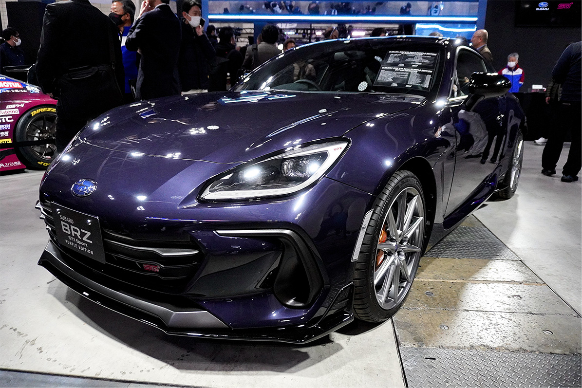 ブースには前日の1月9日に発表されたばかりの、BRZの特別仕様車「STIスポーツ パープルエディション」もお披露目されています。深い紫の特別塗装色「ギャラクシーパープル パール」をまとったボディに、シルバーのハイラスター塗装を施した18インチアルミホイールを組み合わせ、上質に仕上げられたBRZは、今までの印象と少々違うように見える人もいるのではないでしょうか。