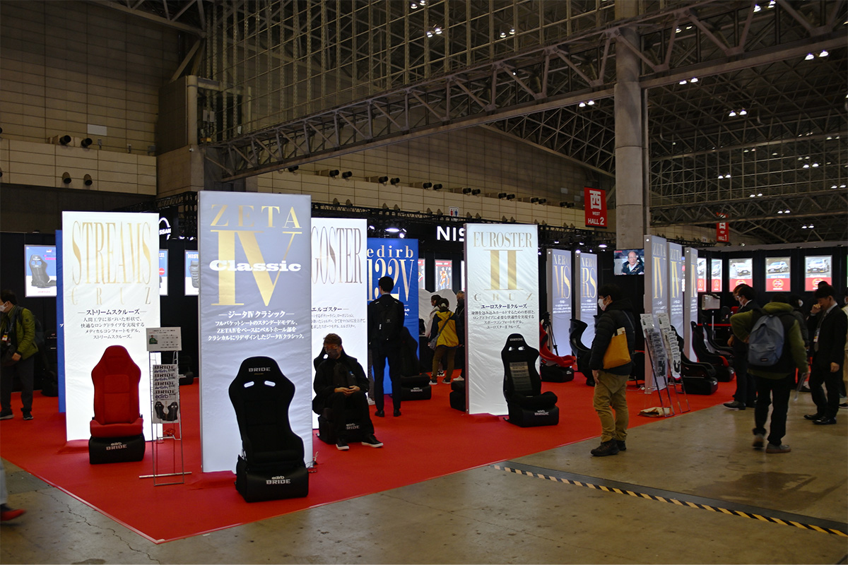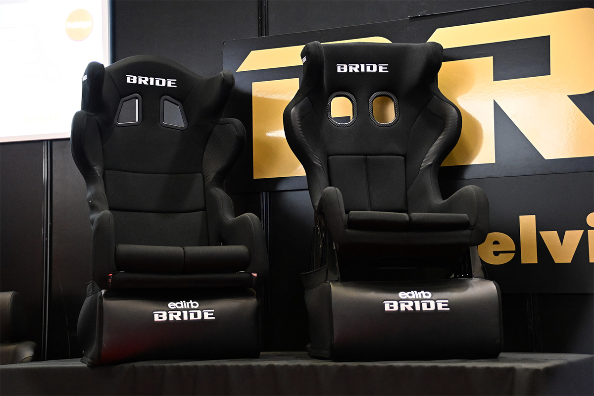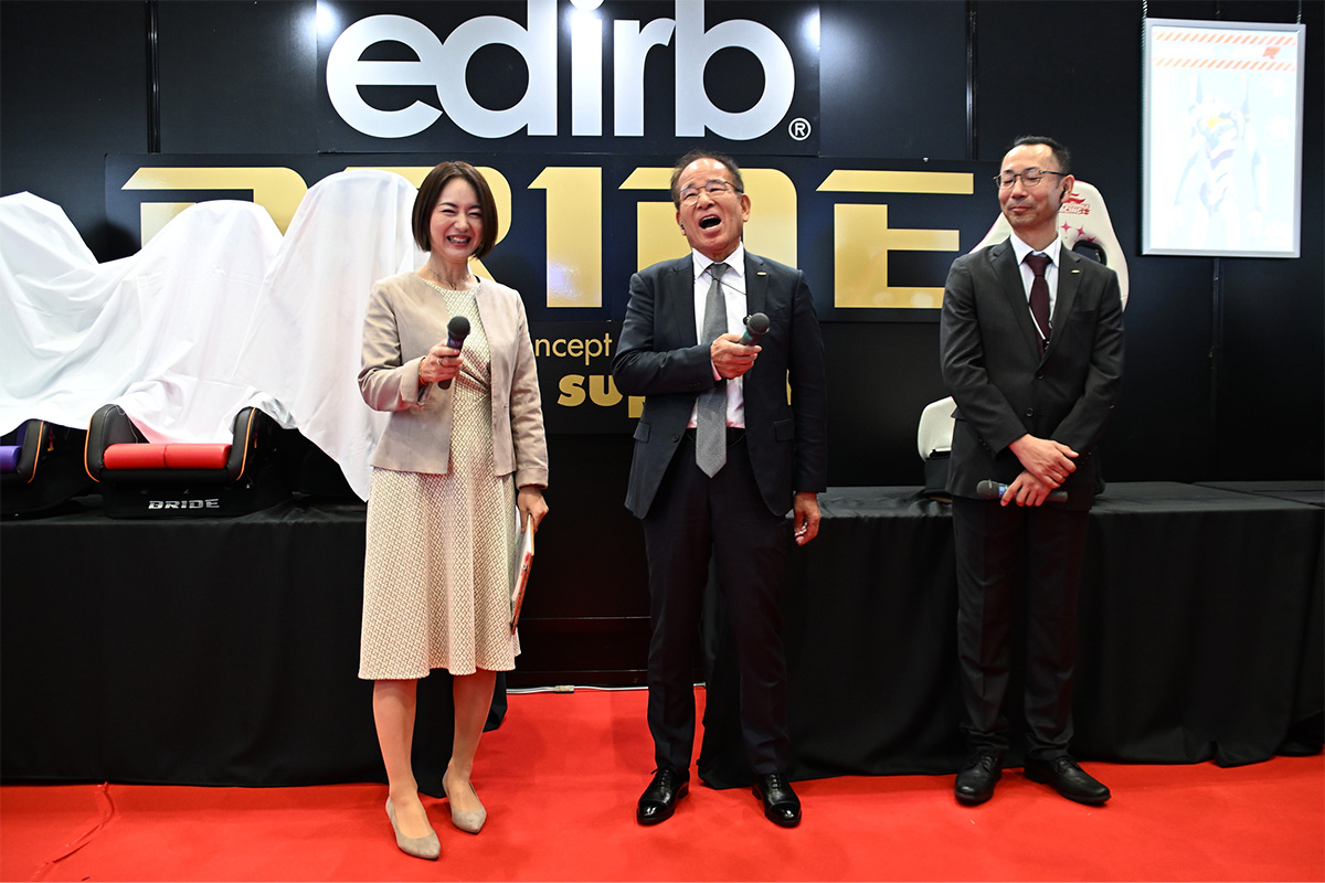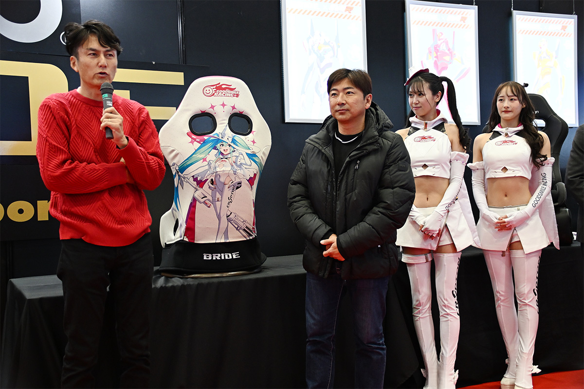 スポーツシートメーカーのBRIDE(西ホール)のプレスカンファレンスでは冒頭、高瀬嶺生社長から今回の概要の説明があり、その後は工場長、そしてコラボ先の担当者とともに各種シートの説明が行われました。