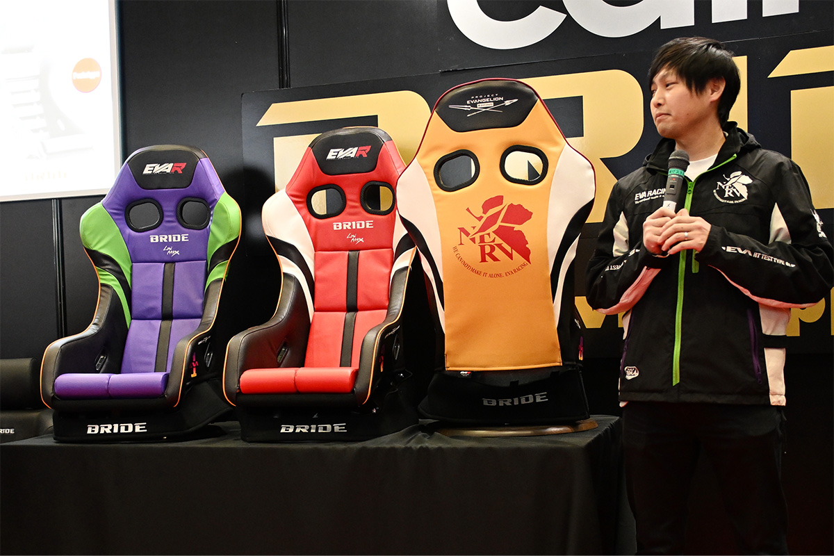 まず最初に紹介されアンヴェールされたのは3脚の「ZETA IV」です。それぞれ新世紀エヴァンゲリオンに登場しているEVA初号機、弐号機、零号機のカラーリングを施したシートで、背面にはNERVのロゴマークとEVANGELION RACINGのロゴが入っています。この色の再現については苦労をしたようですが、納得の出来ということです。