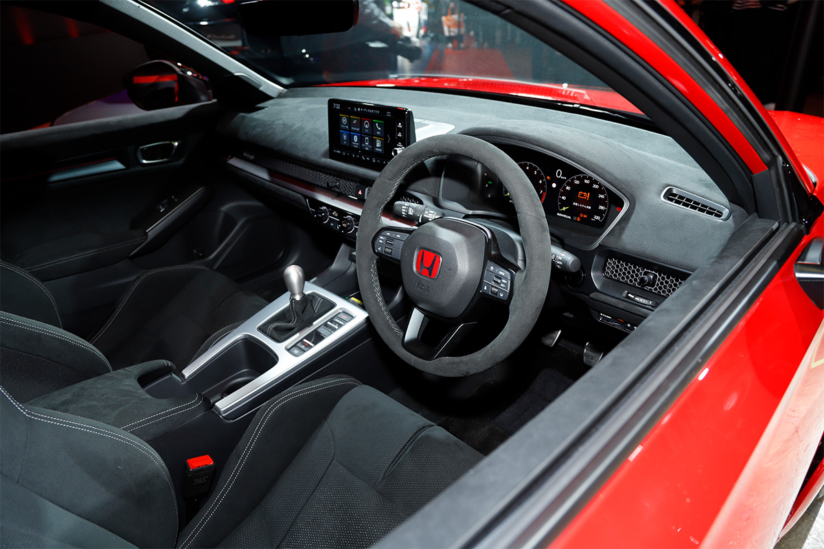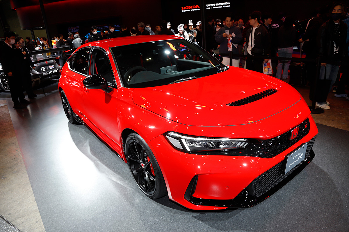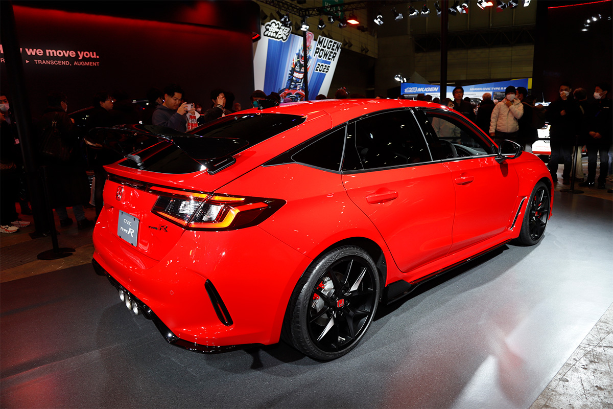 メインステージ前に展示されたのは、現行シビック タイプRの新グレードである「RACING BLACK Package(レーシングブラックパッケージ)」です。現行シビック タイプRは、人気の高さゆえ受注台数が生産能力を大きく越えており、新車販売は受注停止が続いていたが、ようやく見通しが立ったということで2025年1月23日(木)から販売を開始するそうです。