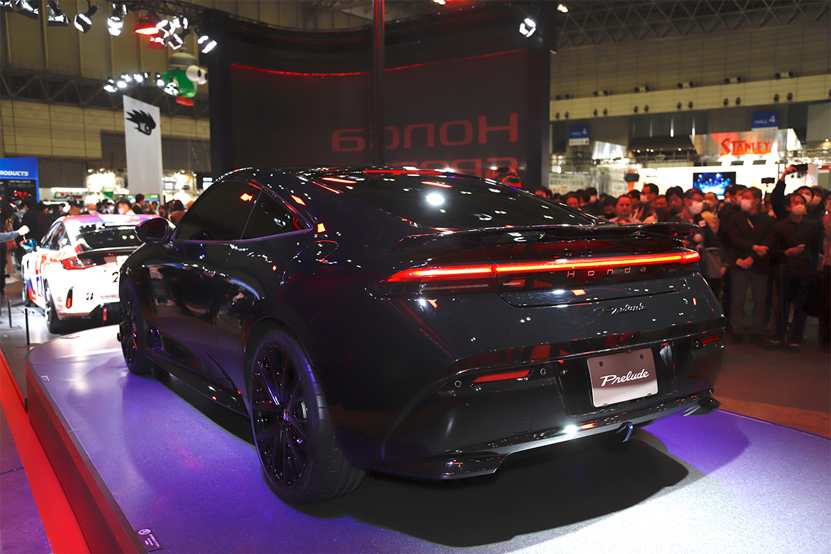 そして「プレリュード・プロトタイプ」は、コンセプトモデルをベースに、エアロパーツでモディファイがなされた車両。ボディカラーがブラックであるため少々わかりづらいですが、カーボン素材を連想させる外観のリアスポイラー、フロント&リアのアンダースポイラーなどが装着されています。