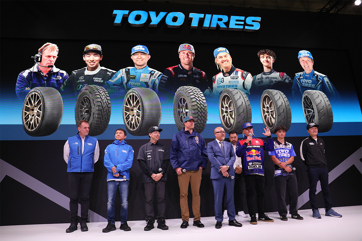 TOYO TIRESが誇る各カテゴリーのサポートドライバーも登壇。右から、川畑真人選手、リンカーン・ウィデット選手、マッド・マイク選手、ブライス・メンジス選手、能戸知徳選手、木下隆之選手、そしてRing Racingのウベ・クリーン監督。各カテゴリーで活躍する選手やチーム関係者が一堂に会する機会は東京オートサロンならではの光景です。
