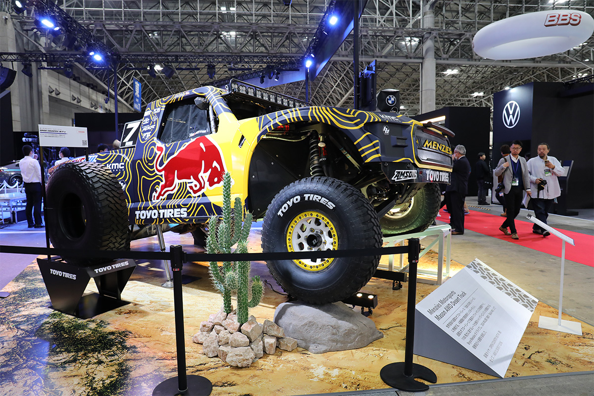 プレスカンファレンスに登場したRed Bullサポートドライバー、ブライス・メンジス選手が世界屈指の過酷なオフロードレースSCORE World Desert Championshipで駆った競技用車両。2024年のBAJA400で優勝、4連覇を達成しました。