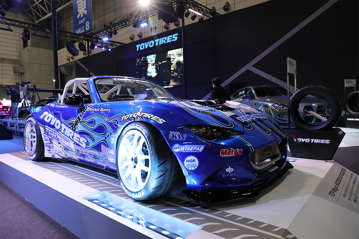 2025年で創業80周年を迎えたTOYO TIRES。東ホール7に構えたブースには、各カテゴリーで活躍する世界的に有名な車両が勢揃いしています。