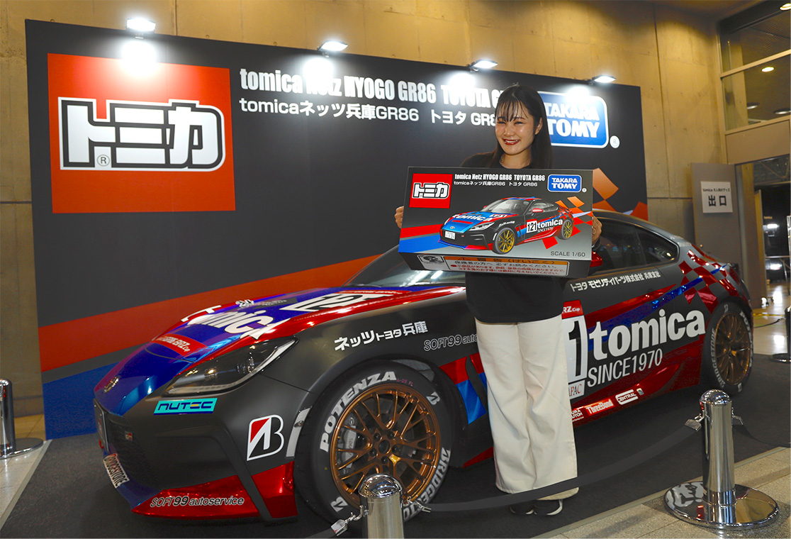 今回の「東京オートサロン 2025」において、トミカはメイン通路となる「中央モールスペース」にブースを出展。オートサロン限定トミカを含む様々な新製品が披露されるとともに、トミカにもなっているトヨタネッツ兵庫GR86のレースカーが展示されている。