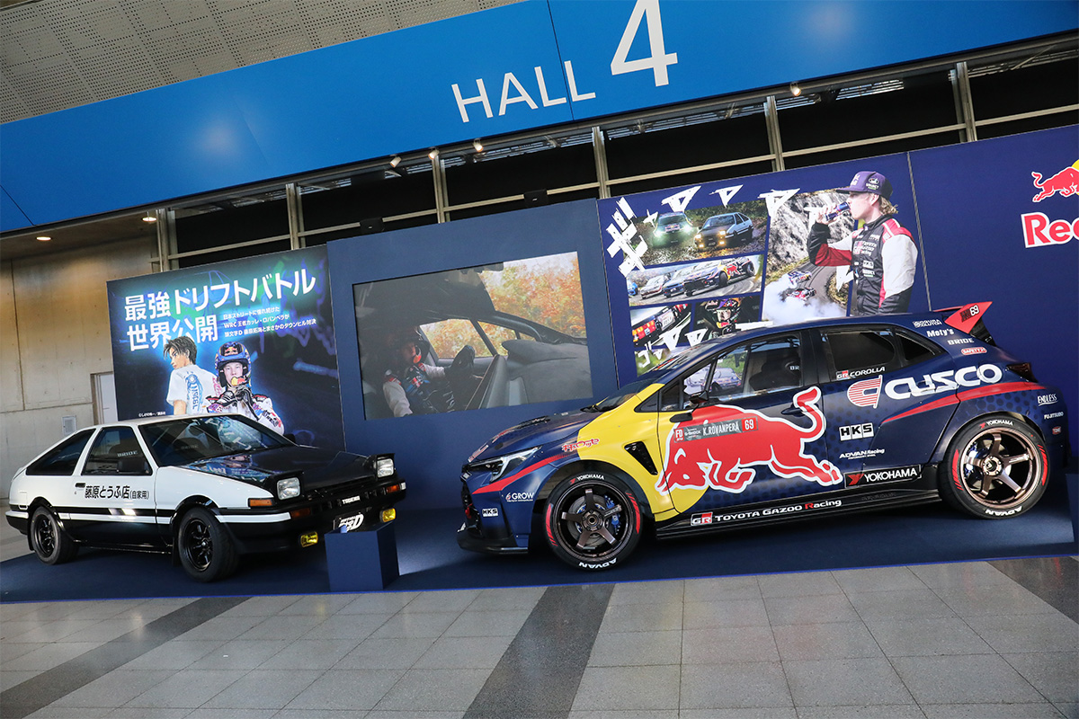 ロケ地となったのは、青森県弘前市にある岩木山。カッレのゼッケン“69”と同じ、69個のコーナーが存在する。ここをカッレと共に走り抜けたトヨタ・GRカローラと、拓海のトヨタ・スプリンタートレノ(AE86)が西ホール4前の連絡通路に設営されたレッドブルのブースに展示されている。