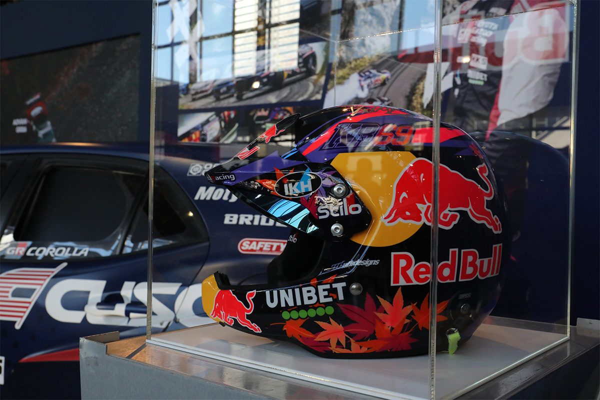 ブースにはカッレが実際に着用したヘルメットも展示中。弘前城をあしらったスペシャルデザインをじっくりと確認できるチャンスはとても貴重。実車とヘルメット。そして、峠最速を目指す頭文字Dの藤原拓海とWRCチャンピオン、カッレ・ロバンペラの熱い走りを、東京オートサロン2025のレッドブルのブースでご覧あれ!