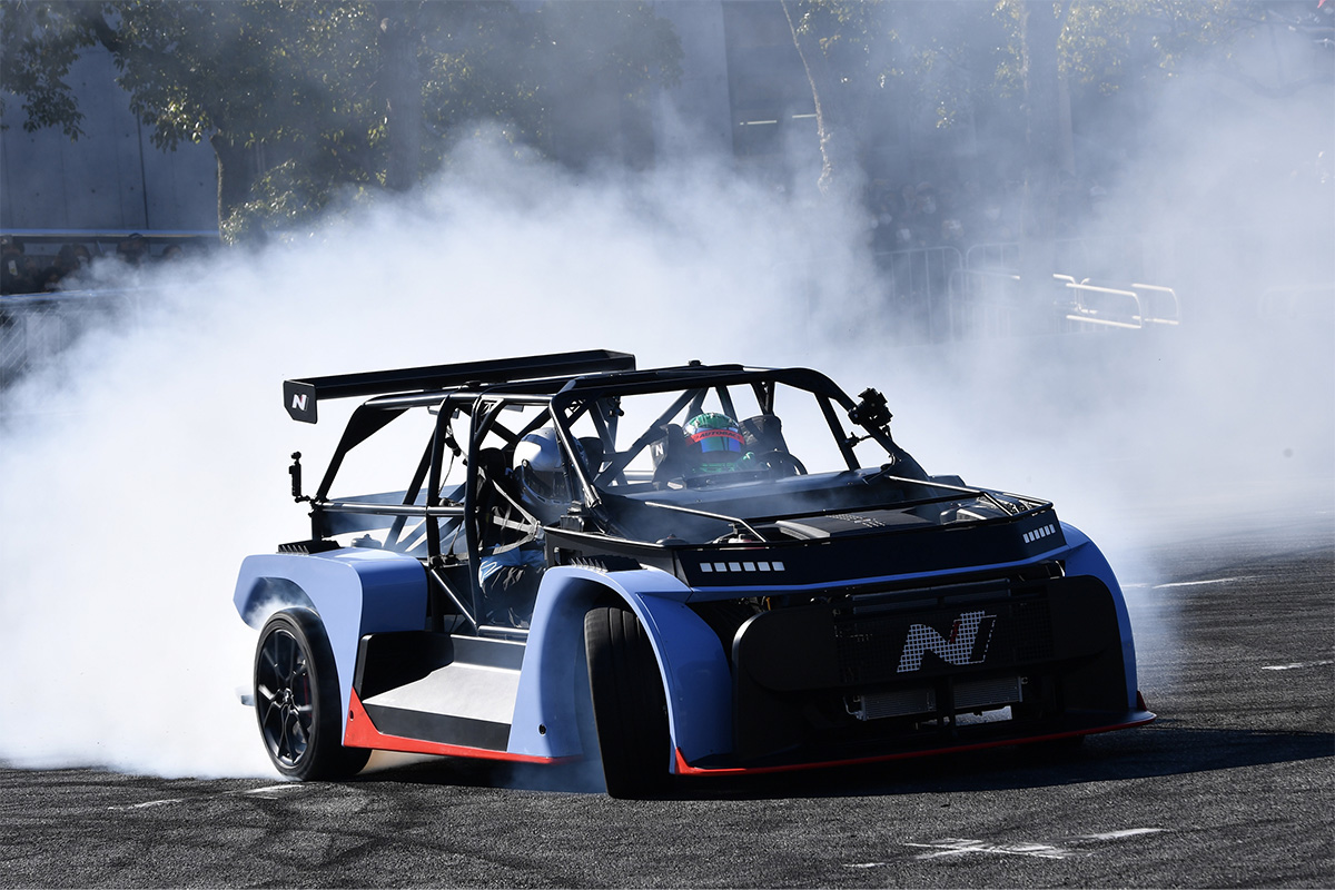 東京オートサロン2025では、昨年に引き続いて韓国ヒョンデのデモランの時間が設けられた。デモランに登場したのは、レース直系のNブランドのピュアEVである「IONIQ5N(アイオニック5N)」、そして、そのアイオニック5Nのユニットを使いながらホイールベースを短く、そしてボディパネルを取り払って軽量化し、ヒョンデのWRCでの車両づくりを投影したテスト車両「RN24」の2台。