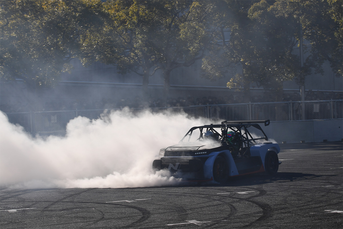当初は谷口選手が先にデモランを走るはずが、スタート時に4WDからRRに変更するのに手間取ってしまい、土屋氏のRN24が先にコース走行をスタート。ドリフト車両以上にしっかりと白煙を上げながら走行を重ねた。遅れてスタートしたアイオニック5Nもそのパフォーマンスをしっかりアピールした。