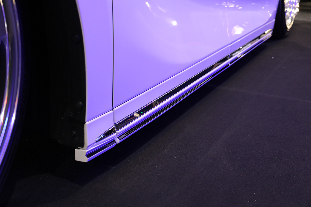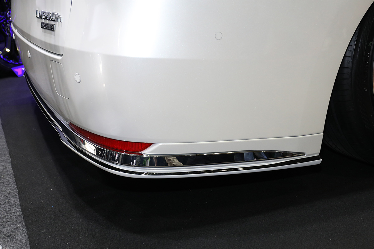装着されているT.productのオリジナルエアロは3点。フロント、サイド、リア各部に装着されており、LMが持つ上質感はそのままに、わずかにスポーティ感を演出。純正バンパーからの繋がりがとても自然で、まるで純正オプションパーツであるかのような上品さが必見です。