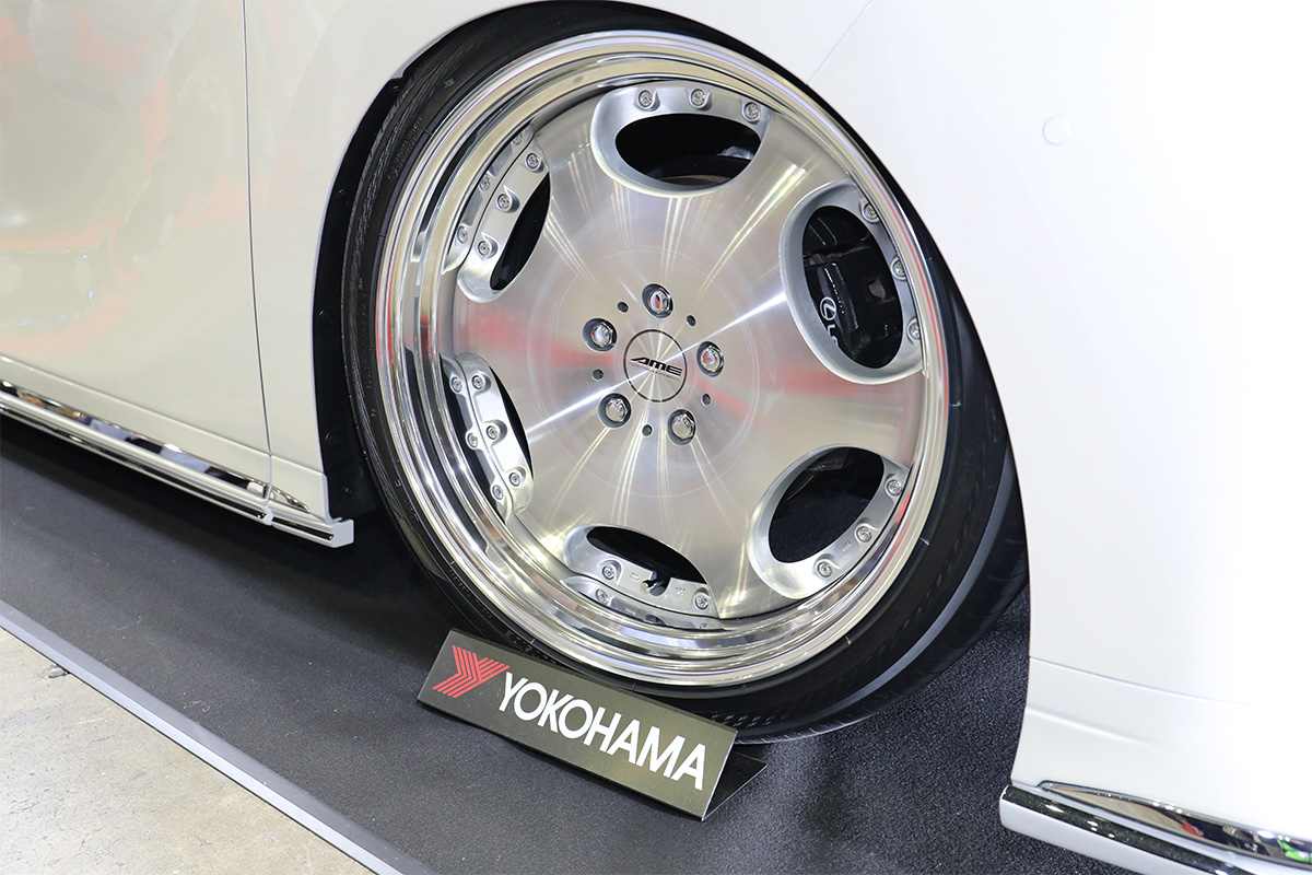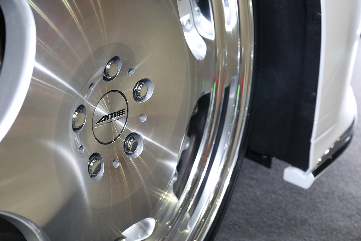 ホイールはAMEシャレンLXを選択。この商品は2002年に発売が開始され、当時のドレスアップミニバンやセダン界隈で大人気。惜しまれつつも2007年に生産が中止されており、発売時から換算すると23年ぶりに復活したホイールとなります。当時物をそのまま復刻したのではなく、センターキャップのサイズやディスクの抑揚感などをリデザインし、古き良きポイントを再現しつつ、細部で最新デザインでアップデート。当時は15~20インチのラインナップでしたが、今回は20~21インチという大径から発売されるそうです。今後はユーザーからより情報を集め、カラーバリエーションや他サイズの展開も検討中とのことでした。