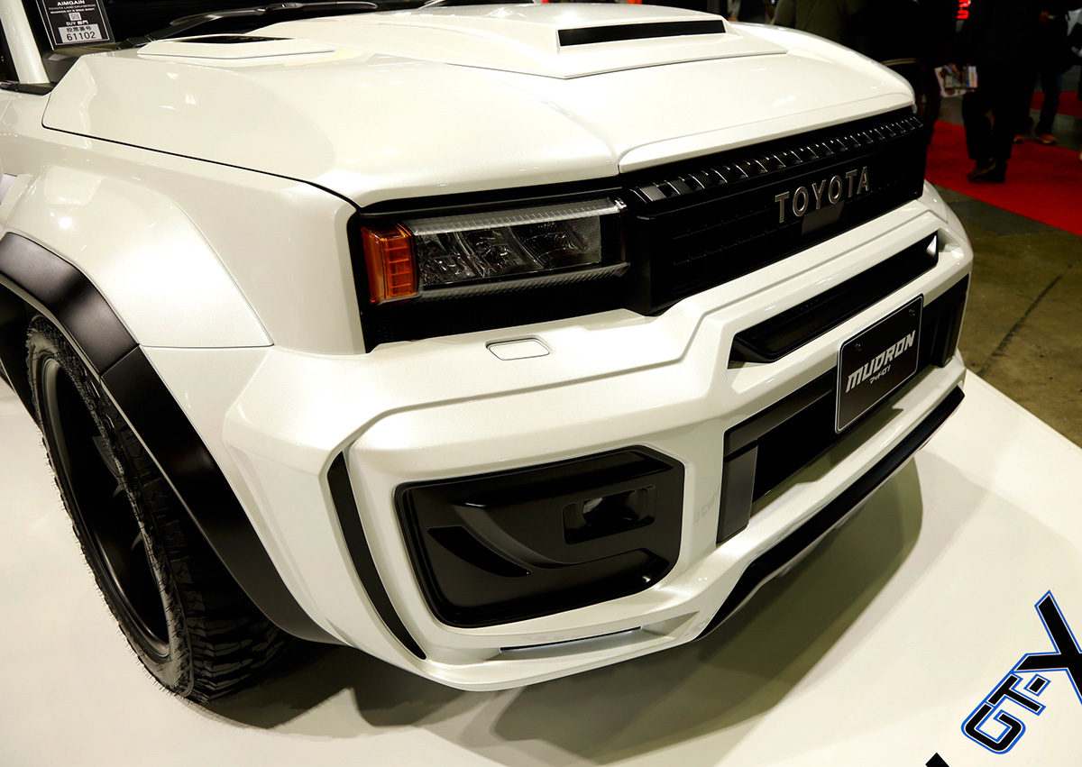 今回、MUDRONが発表した「GT-X LC250」は、人気の250系ランドクルーザーをベースにエアロキットを装着、さらにエアサスやタイヤ&ホイールを装着したもの。ボディキットは片側7cmのワイド化を実現する前後フェンダーのほか、フロントバンパー、フロントルーフスポイラー・タイプGT、リアゲートスポイラー、ボンネットダクトカバーなどで構成されています。