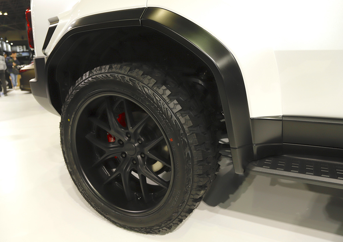脚まわりは、BOLD WORLD製エアサスペンションを装着。ホイールはエイムゲイン製GTM-Xで、前後とも22×11.0Jという大迫力サイズ。タイヤはYOKOHAMA GEOLANDAR M/Tの33×12.5R22サイズが組み合わされています。