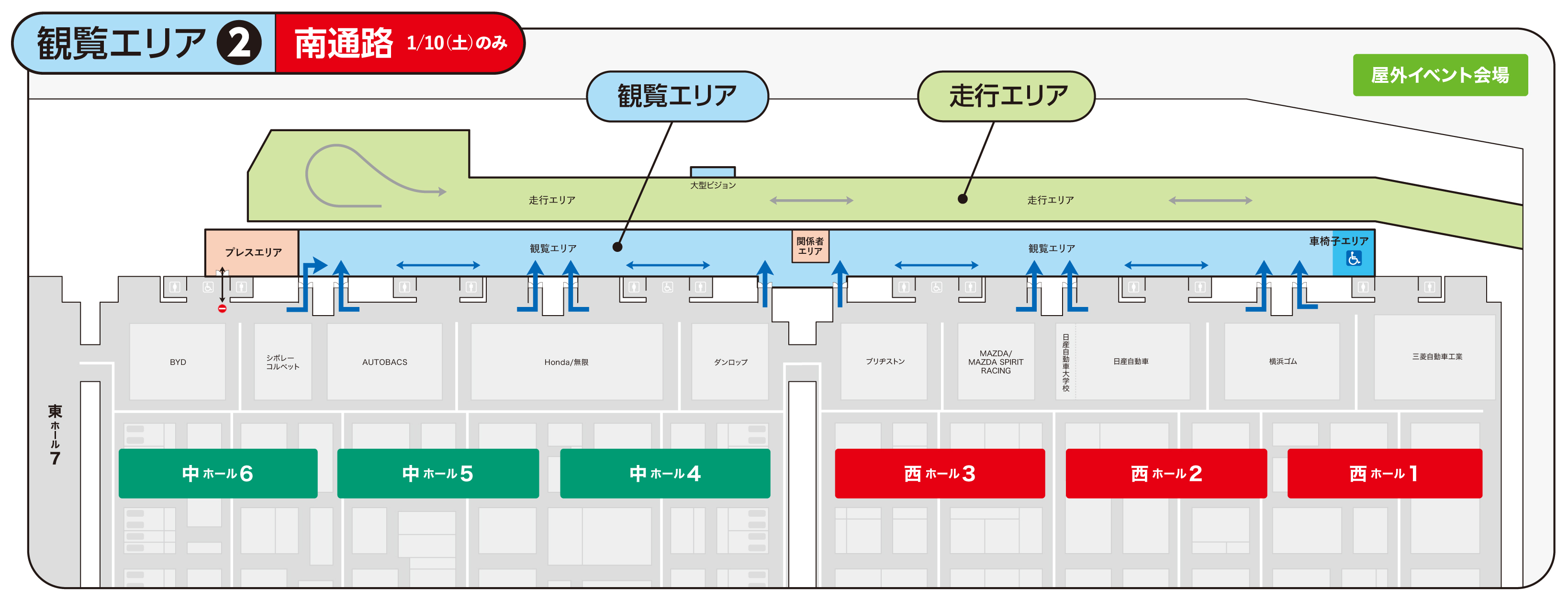 - 南通路観覧エリアへの入場可能時間は、10日(土) 9時~12時30分となります。1~6ホールの鉄扉よりご入場いただけます。